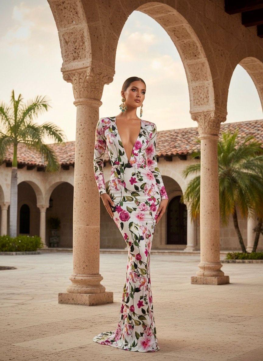 Vestido con estampado de flores, totalmente pegado al cuerpo.